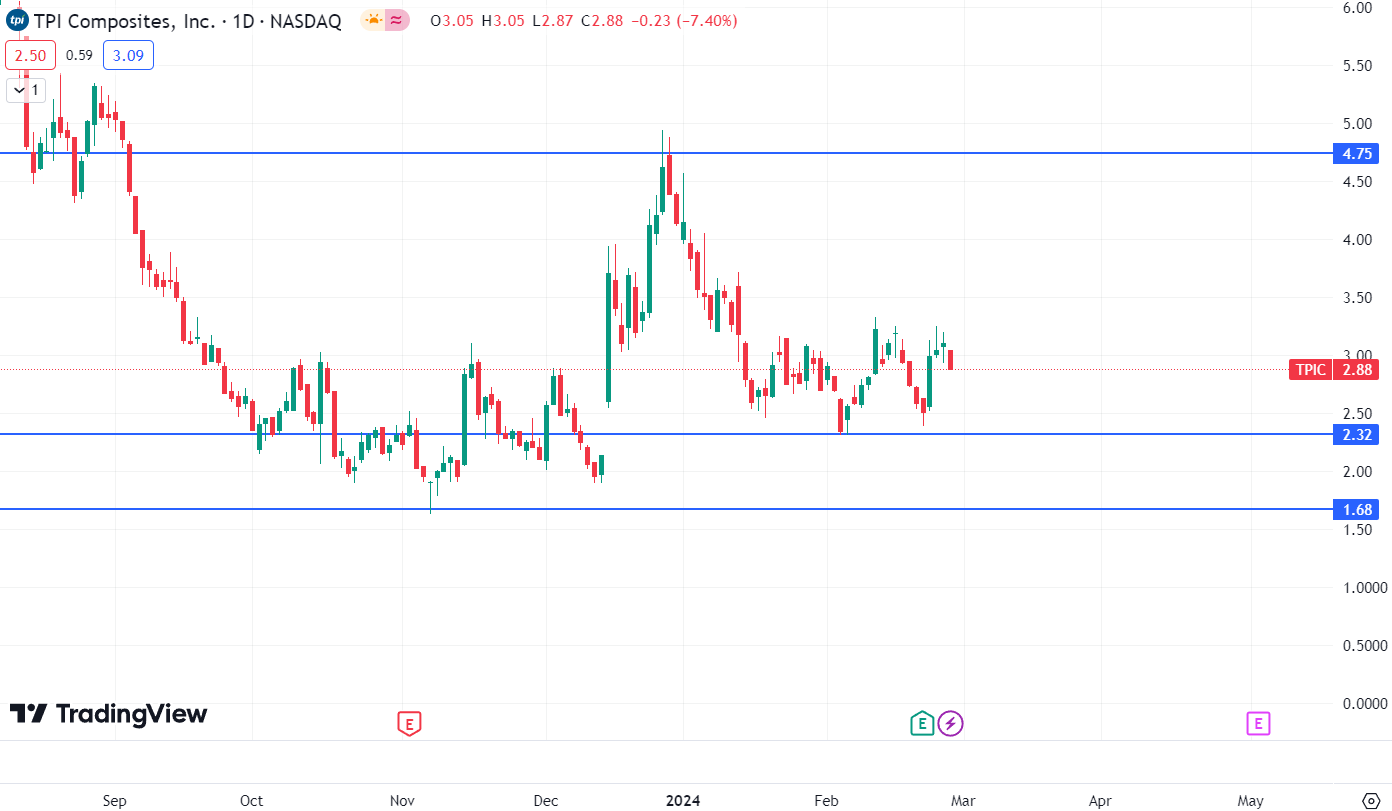 There are two reasons I am not assigning a sell rating to it. The first is, although its price chart is bearish now. In the weekly time frame, $1.9 is the last support level, but in the daily time frame, there is another support level before $1.9, and that is $2.32. There is a possibility that the share price might create a double-bottom pattern near the support zone of $2.32; if it does, there is a possibility of a turnaround because the stock has already fallen quite a lot. There might be a possibility that the market might have already factored in all the negatives. The second reason is that TPIC is trading at a Price / Sales ratio of 0.09x, which is quite low.