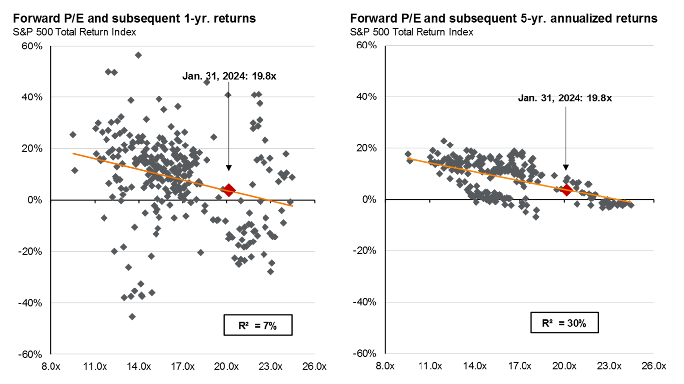 Using the JPMorgan (JPM) data below, we see that going into this month, the valuation of the S&P 500 (SP500) was rather stretched, indicating subdued longer-term returns.