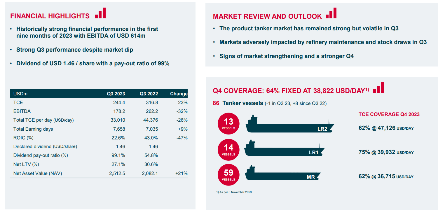 Last go-round, TRMD reported a solid quarter despite tougher industry conditions. Time Charter Equivalent (TCE) revenue verified at $244.4, a 23% decrease from $317 million earned in Q3 2022 while its return on invested capital plunged from 43% to just 22.6%. The management team remained committed to paying out a high dividend – the payout ratio was 99% - I would like to see improved earnings metrics so that free cash flow sustains in the years ahead. Overall, its net asset value rose 21% to $2.513 billion. On the call, TORM cited a more volatile third-quarter operating environment with refinery maintenance and stock draws impacting results, though management was optimistic about a better Q4.