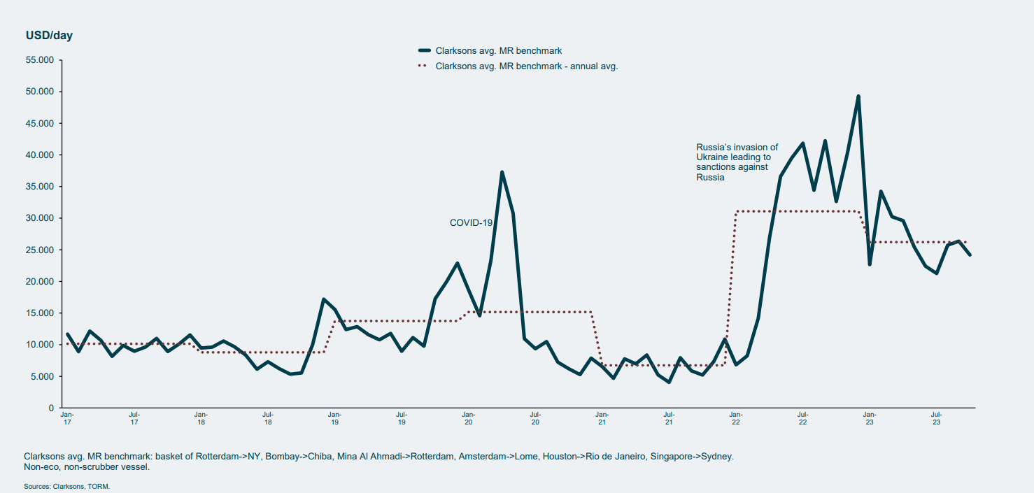 But the firm expects continued support for the product tanker market, with positive demand and supply drivers, trade recalibration benefits, and refinery dislocation. A key risk is how interest rates evolve as TORM acquires new vessels through financing, though there was confidence that its current leverage level is appropriate. Of course, ebbs in the global macro growth trajectory are also important to monitor.
