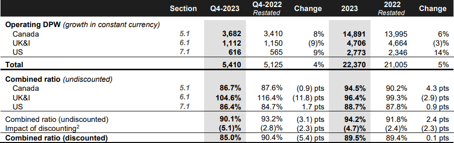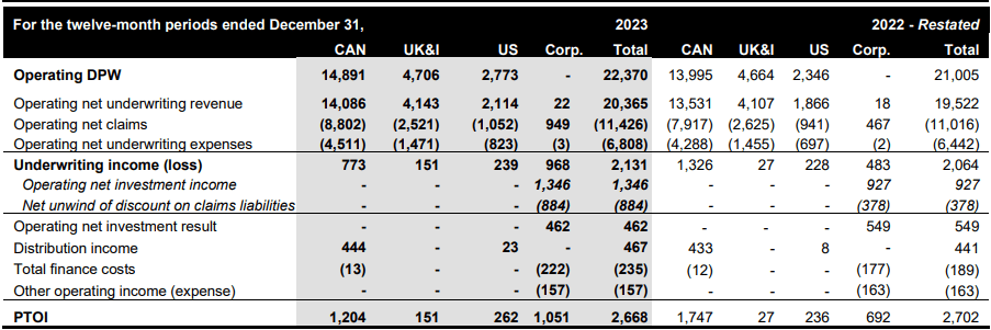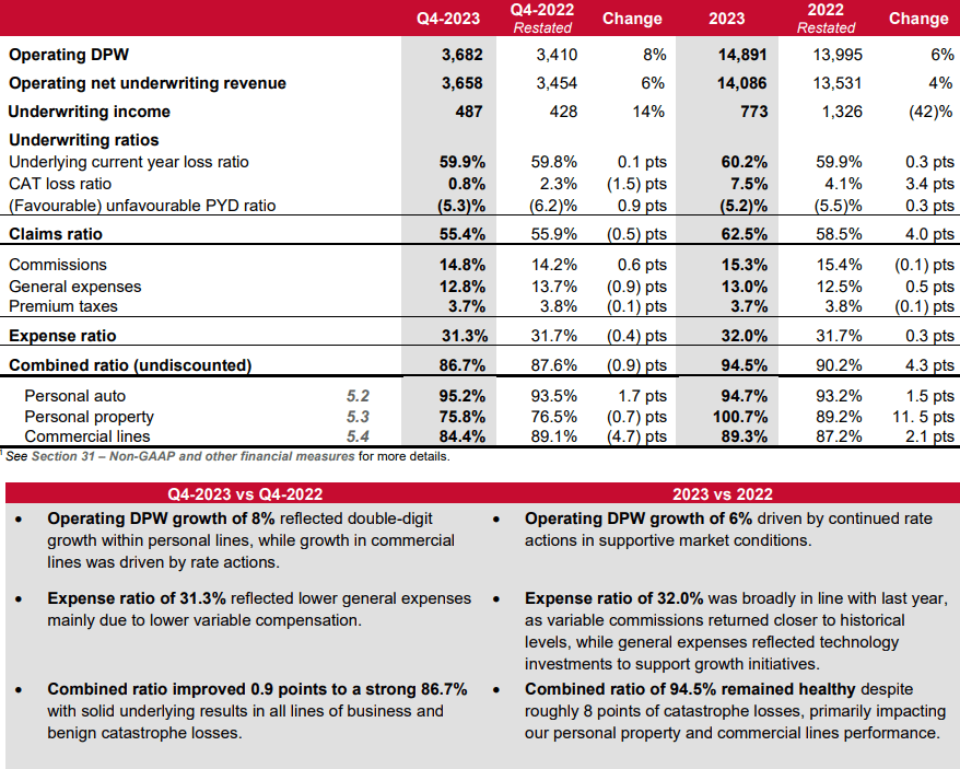 What is not highlighted is that, with the hard reinsurance market that started in 2022, Intact changed the structure of their reinsurance protection, so they carry a bigger proportion of cat losses before reinsurance protections kick in. I couldn't find details of the impact of this change. All in all, this represents a deteriorating underwriting performance for 2023.
