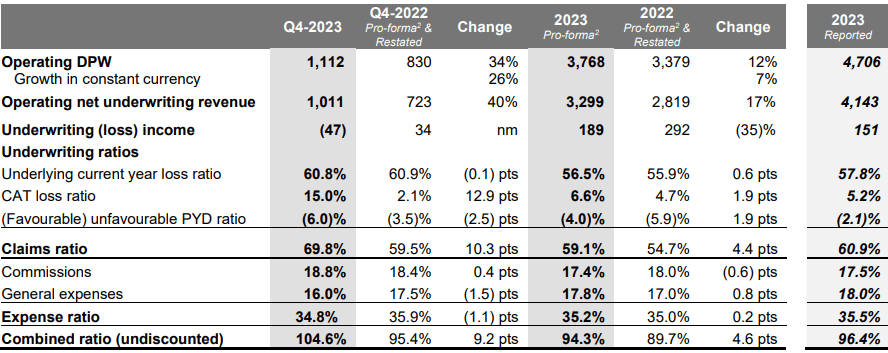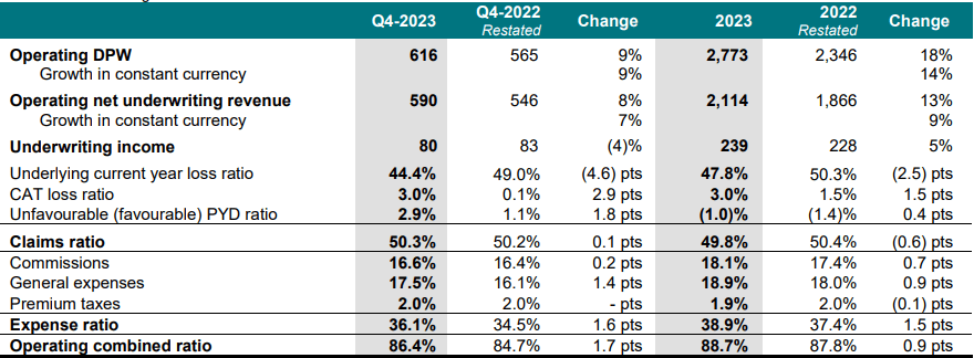 Business performance for 2023 was not great, with a deterioration in the combined ratio of 4.3%, albeit to a still profitable 94.3%. This was driven by an increase in catastrophe losses.