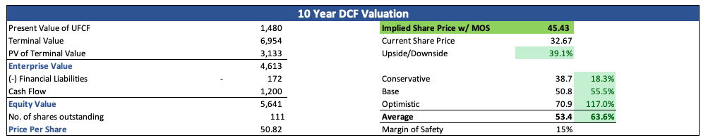 I looked back at the last DCF model that I made for the company, and I didn’t see much to change, except for the risk-free rate, which changed only slightly, I also updated the financials up to the end of 2023. The assumptions were already quite conservative in the model, so I’m ok with them going forward, as I do believe that the company will see a decent recovery in its revenue growth and margins will improve also. In my model, I went with a reduction in margins and subsequent recovery over the next decade to the margins seen at the end of 2023, so no further improvement is assumed, to keep it safe. I am, however, updating my final intrinsic value to around $45 a share, which implies the company still trades at a decent discount to its fair value.