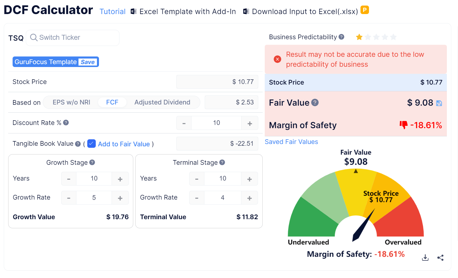 Based on the DCF, using a discount rate of 10% (10-year Treasury (US10Y) at 4% plus 6% equity risk premium) and forward free cash flow per share assumption of $2.53, the firm’s shares would be valued at approximately $9.08 versus the current price of $10.77, indicating they are potentially currently overvalued by about 18.6%.