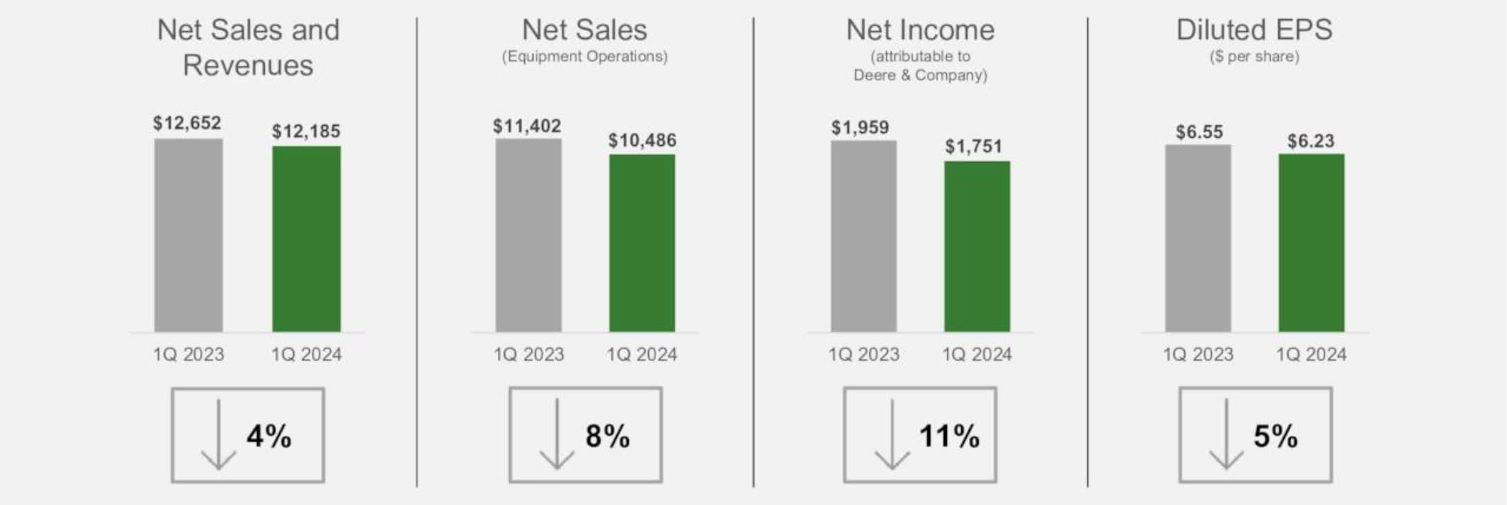 As far as the four segments, net sales declined in all but construction & forestry where these were flat at $3.42 billion. Small agriculture sales were hit the hardest, down double-digits at 19% to $2.425 billion. Production & Precision sales and Equipment Operations sales were down 7% and 8% respectively.