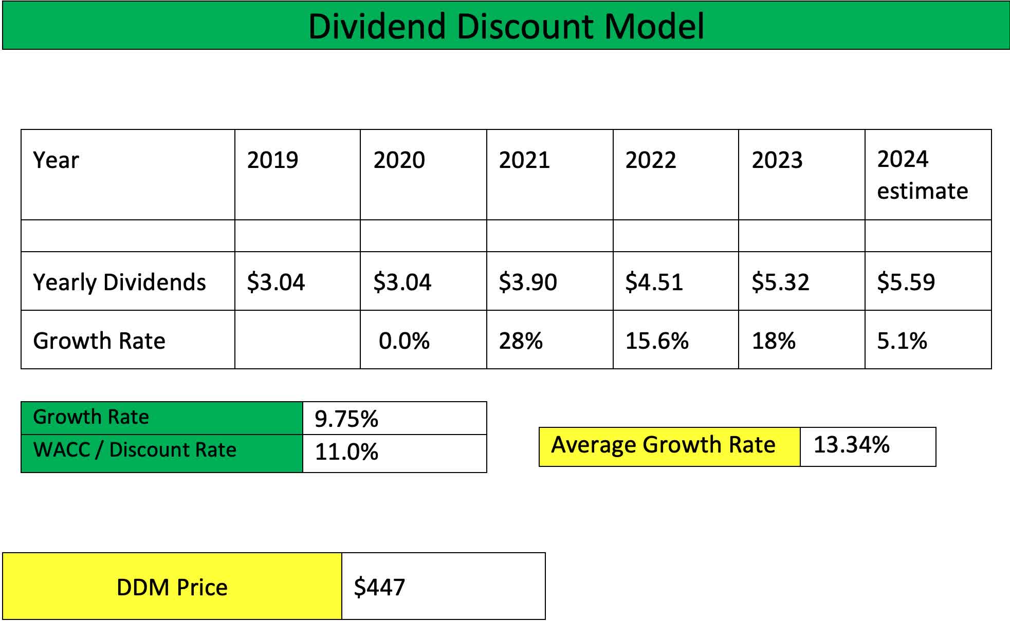 Using the dividend discount model, I have a price target higher than Wall Street's $418. DE has an 5-year average dividend growth rate of 13.34% and I use an expected growth rate of 9.75% to be conservative and manage expectations going forward. Still the stock offers massive upside from the current price.