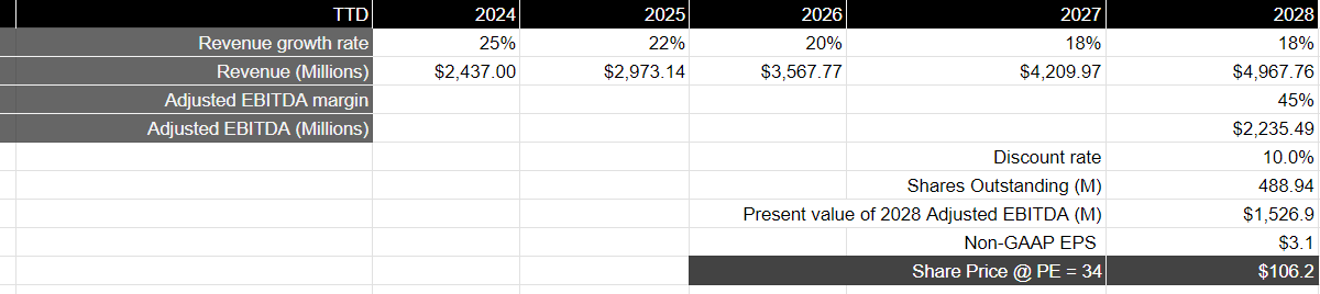 Assuming that Trade Desk grows 25% in FY24, slightly higher than mid-point consensus estimates, followed by growth in the low 20’s range until FY26, then growing in the high teens thereafter until FY28, the company should be able to generate close to $5B in revenue by FY28. I believe this is achievable as the company continues to drive penetration in the growing digital advertising space, in segments such as CTV, audio, and retail, while continuing to innovate its platform by building AI capabilities to drive superior outcomes for their clients. Meanwhile, assuming that the company is able to maintain its Adjusted EBITDA margin of around 45% through FY28, it should generate approximately $2.2B in Adjusted EBITDA, which translates to a present value of $1.5B in FY28 when discounted at 10%.