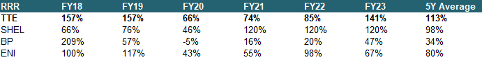 Going forward, management announced a fixed lower cap of 40% of CFO to be distributed back to shareholders with FY23 returned capital at ~44%. This framework is one of the best among EU majors with Shell and ENI targeting 30-40% and 25-30% of CFO respectively. BP aims to pay out 80% of surplus cash flows (post-dividend-FCF) which can, based on Capex needs, exceed 40% of CFO, however given higher volatility in Capex I prefer a more resilient allocation based on CFO.
