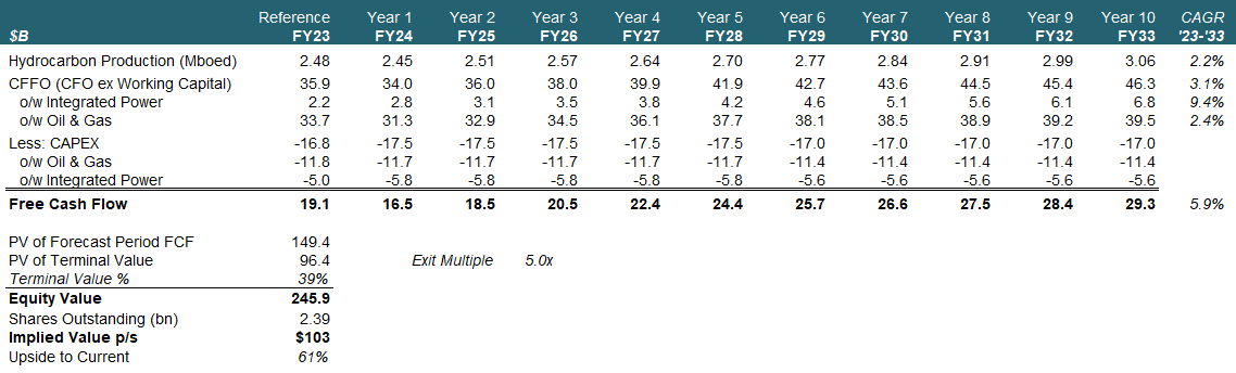 For Capex I estimate ~$17.5B per year from FY24-28 at the upper end of $16-18B guidance, after which I assume a slight decrease in Capex to $17B as major O&G projects will have achieved first oil by then. Across the cycle, management will keep ~$2B in Capex for flexibility in lower price environments, however I do not assume those in my base case.
