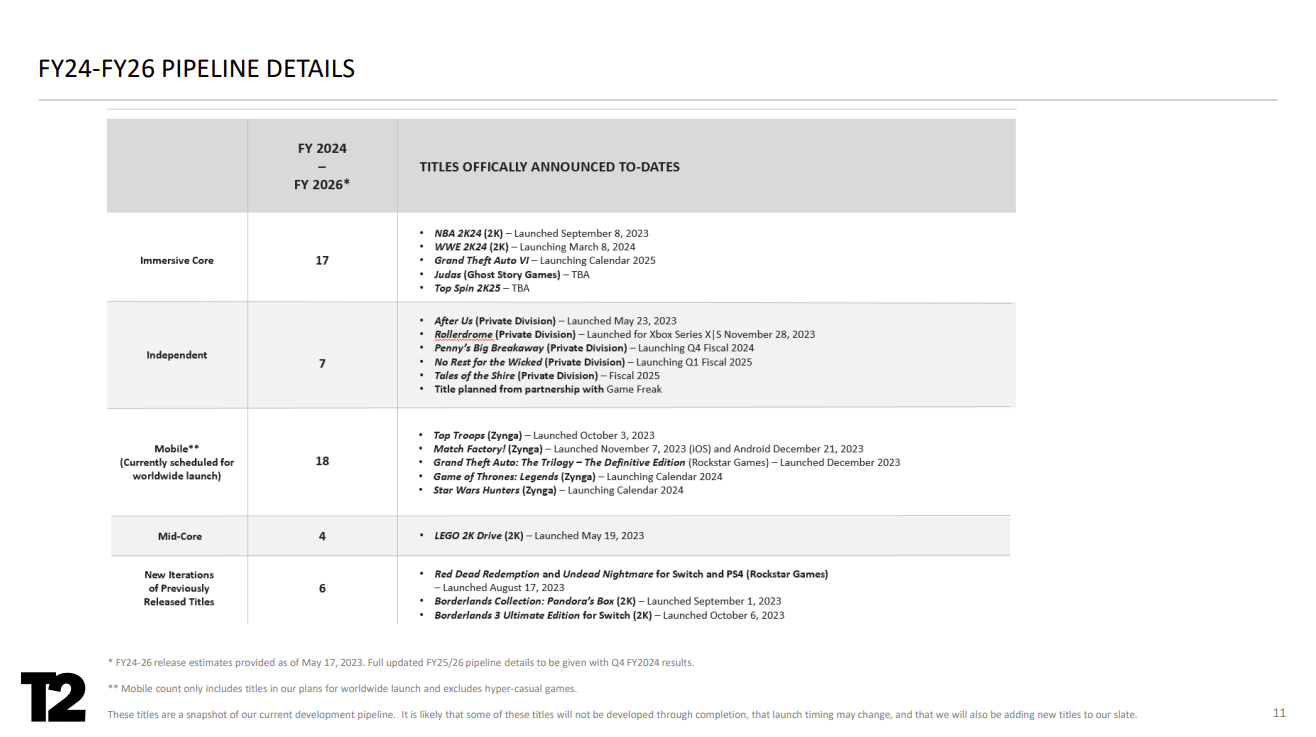 Take-Two Interactive's portfolio of games includes major franchises like BioShock, Borderlands, Civilization, GTA, Mafia, Max Payne, NBA 2K, PGA Tour 2K, Red Dead, WWE 2K, and XCOM. GTA V is one of the most profitable and well-known in its portfolio, and GTA VI is expected to follow suit.