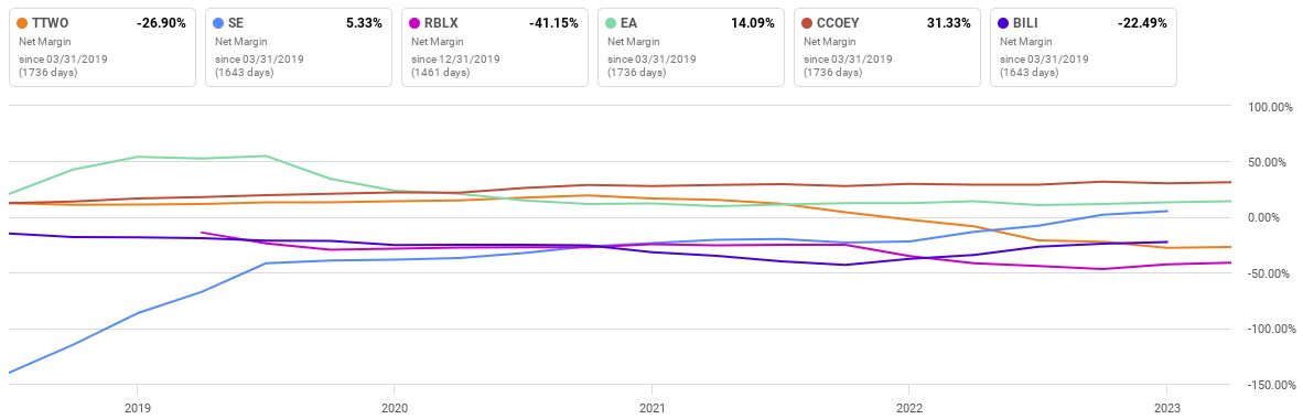 Most notably, at this time, TTWO's TTM net income margin is negative, at -26.9% as of the last report, significantly worse than the sector median of 3.45%. If we compare this to some of TTWO's similar-sized peers, we can see that it also ranks considerably poorly:
