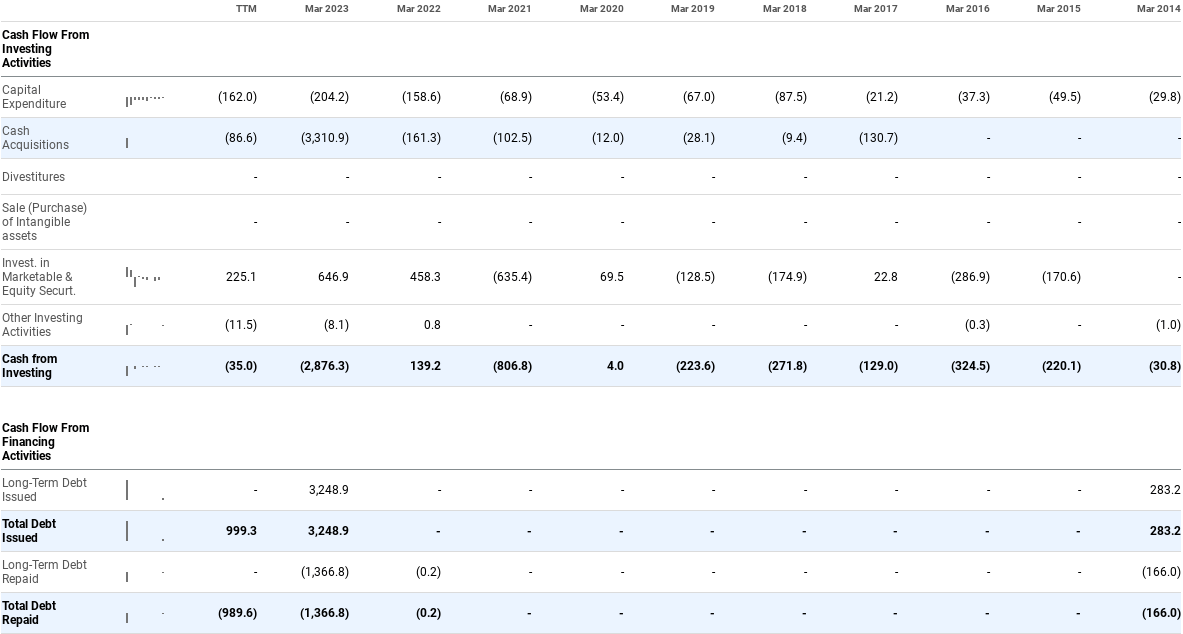 We can also see on the cash flow statement that a significant amount of debt was issued last year for a cash acquisition cost of $3,310.9 million. The company repaid $1,366.8 million of debt that year when it issued $3,248.9 million.