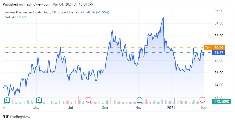 Mirum Pharmaceuticals' headquarters is in Foster City, CA, just outside of San Francisco. This commercial stage biopharma is focused on the development of novel therapies for debilitating rare and orphan diseases. The stock trades for around $30.00 a share and sports an approximate market capitalization of $1.35 billion.