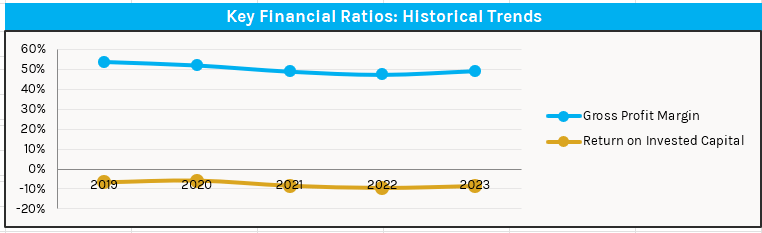 The gross profit margin has been falling, and the return on capital remains stubbornly negative.