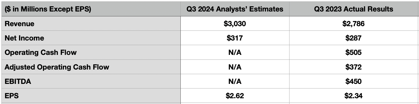 If this comes to fruition, it would be about 8.8% above the $2.79 billion generated the same time of the 2023 fiscal year. Earnings per share, meanwhile, are expected to be around $2.62. That would be up from the $2.34 reported the same time in 2023, translating to an increase in net profits from $287 million last year to $317 million this year. Unfortunately, estimates were not provided when it came to other profitability metrics. But in the table below, you can see what the important ones were are the company, and what they were for the third quarter of the 2023 fiscal year.