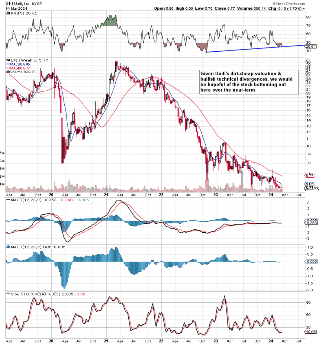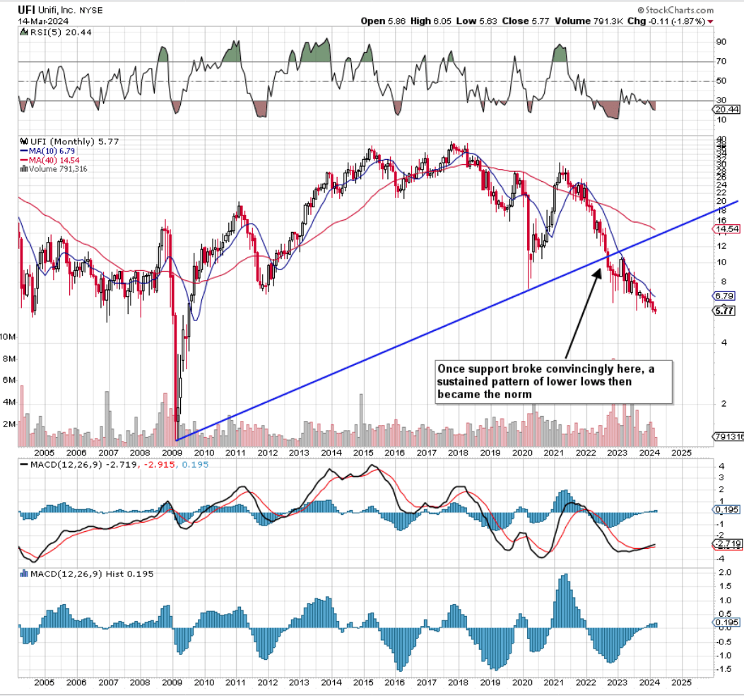 Suffice it to say, given the growth & profitability challenges Unifi was dealing with at the time, the jury was still out on whether shares would be able to maintain multi-year technical support. As we see below, however, long-term support failed pretty comprehensively soon after our 2022 commentary as buyers failed to come to the rescue at approximately $11 a share. This convincing loss of support led to consecutive months of lower lows in the stock resulting in shares being down roughly 58% over the past 20 months or so. This is a sizable opportunity cost considering the S&P500 has risen by close to 29% over the same timeframe.