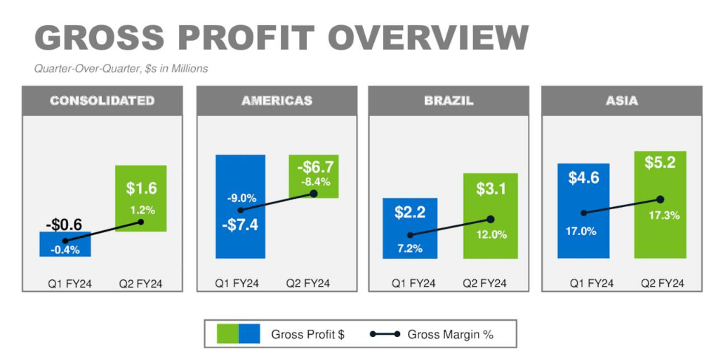 Lower raw material costs and variable cost management efforts provided for overall improved profitability. However, the seasonally lower volume and weak apparel demand environment in the Americas, combined with the selling price pressures in Brazil continued to unfavorably impact gross profit. Variable cost management benefited the Americas and Brazil segments in Q2.