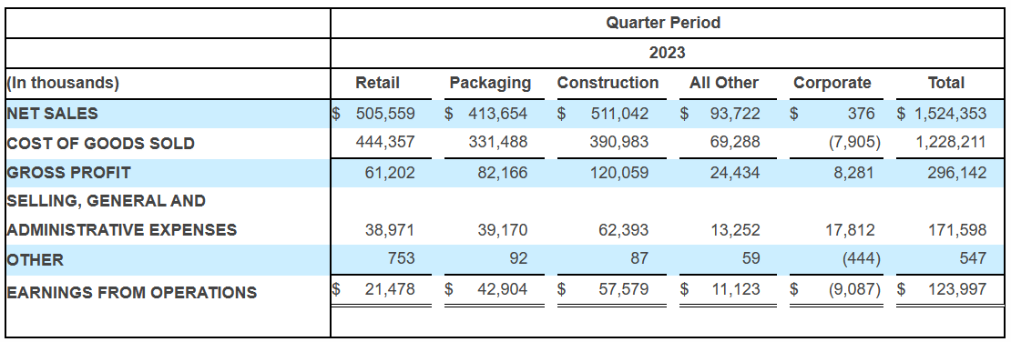 Many of the company's customers in this segment have seen lower demand in their markets, which has translated to less demand for UFP Industries' packaging products. With an added steel packaging facility to add capacity and expand materials offering, the value proposition looks strong for the company long-term however and cost-cutting can already be seen in the company's results. While gross profit was down $49 million in the segment, this was somewhat mitigated by a $10 million decrease in SG&A.