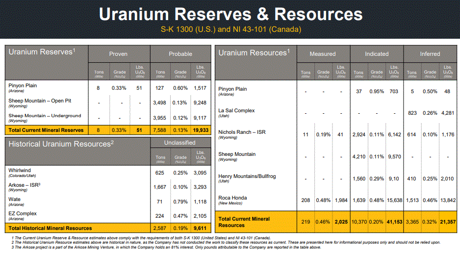 At a rate of 1.4 million pounds/year which is the current goal for production, its proven & probable resources would last about 14 years, while some of the additional resources could be upgraded. It remains to be seen however just how profitable the extraction of uranium will be for the company. Even within the context of the currently favorable market conditions, certain resources may fail to materialize as profitable assets. We will only know in hindsight once the resources are produced because in my experience prior estimates of cost do not always pan out.