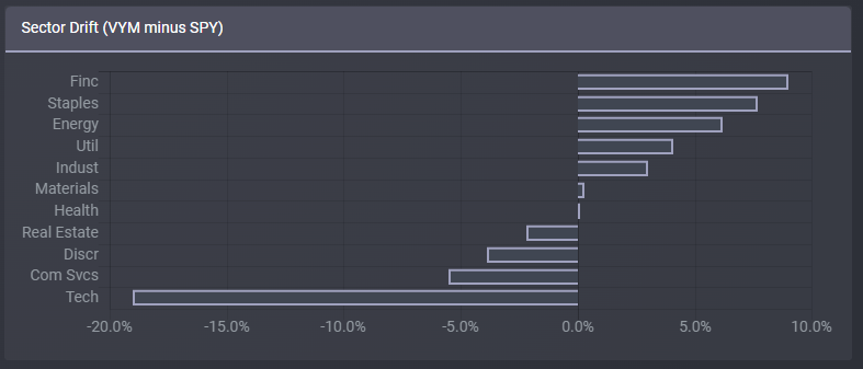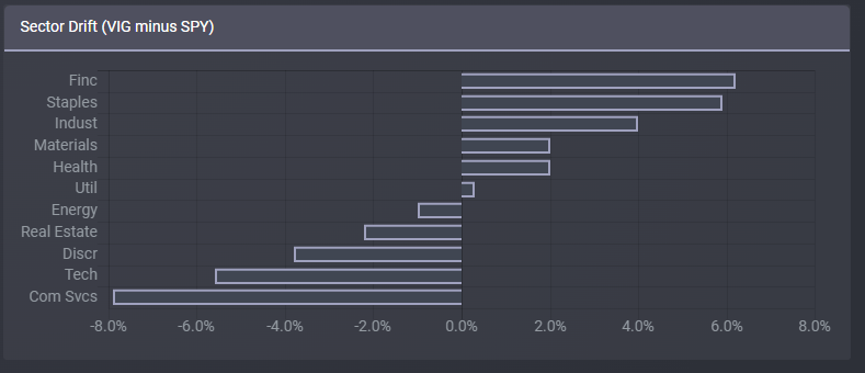 From what I've seen, VIG's sector weights are closer to those of the S&P 500 compared to most other dividend ETFs. As an example, the Vanguard High Dividend Yield Index Fund ETF (VYM), one of VIG's larger peers, is underweight tech a whopping 19.0%, compared to 5.6% for VIG. Same is true for most other dividend ETFs and industries, although gaps do vary.