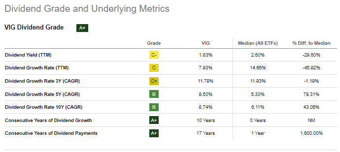 VIG's dividend growth track-record is quite good, and stronger than the equity average, but only slightly so. Dividends have grown at an 8.7% CAGR these past ten years, compared to 7.4% for the S&P 500. Growth has been somewhat steadier too compared to the S&P 500.