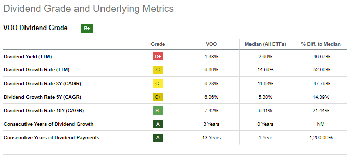 VIG's starting yield is incredibly low, and although the fund's dividend growth is good, it is not great, and definitely not great enough to overcome such a low starting yield. Due to this, income received from the fund is consistently low, even for long-term investors. As an example, the fund sports a 10Y yield on cost of only 4.3%, quite low on an absolute basis, and only slightly higher than that of the S&P 500.