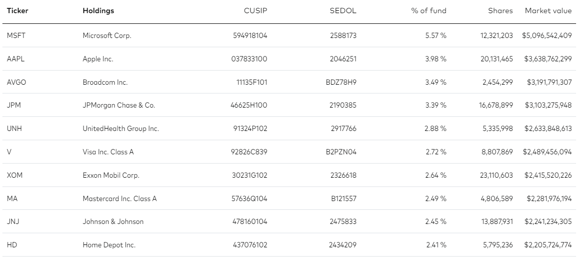 VIG's underlying index is quite broad, which results in a well-diversified fund, with investments in over 300 securities from all relevant industry segments. Diversification seems comparable to that of broader equity indexes, including the S&P 500 and Nasdaq-100. Concentration is about average, with the fund's top ten holdings accounting for 32.0% of its portfolio, approximately the same figure as the S&P 500. VIG's largest holdings are also similar to those of the index, but not identical. These are as follows.