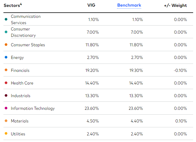 VIG's sector weights are as follows.