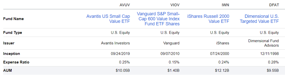 AVUV launched less than five years ago but already has $10.05 billion in assets under management, significantly more than VIOV and about the same as IWN and DFAT. Its 0.25% expense ratio is competitive, so that's not a big consideration. Deciding which is superior comes down to each fund's performance track record and fundamentals.