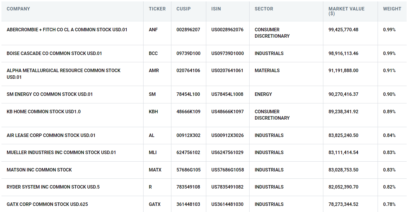 AVUV's top ten holdings, totaling 9% of the portfolio, are listed below. There are approximately 750 holdings, so even Abercrombie & Fitch (ANF), the largest holding, has a weight of less than 1%. The difference in average market cap and weighted average market cap ($1.67 billion vs. $3.20 billion) is worth noting, indicating larger companies tend to receive a higher weight. This likely results from managers' preference for profitability, which correlates positively with size.