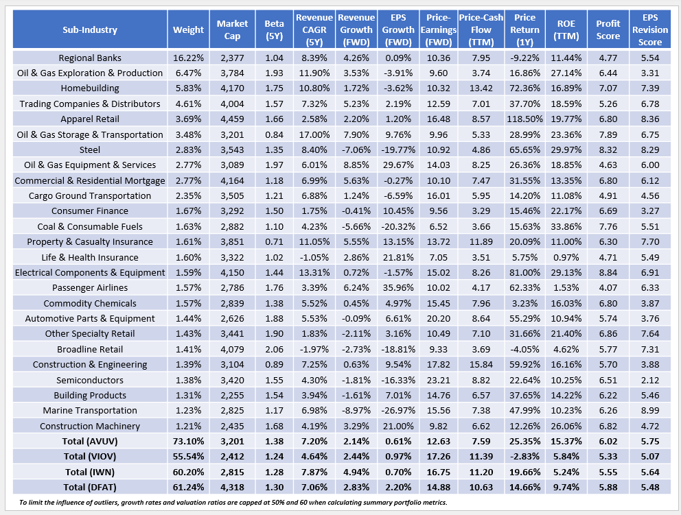 The following table highlights selected fundamental metrics for AVUV's top 25 sub-industries, totaling 73.10%. This figure reveals that despite the portfolio being well-diversified by company, it's much less diversified than its peers.