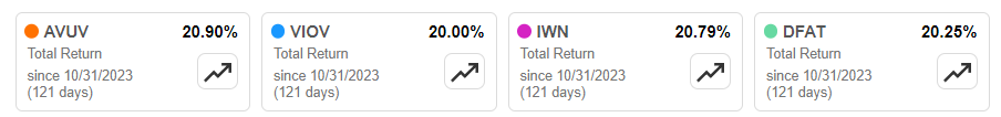 2. Four months ago, AVUV featured 6.01% and 3.05% estimated one-year sales and earnings per share growth. These figures are now 2.14% and 0.61%, so growth is decelerating. In addition, AVUV trades at a slightly higher forward earnings valuation (12.63x vs. 11.23x), and it's difficult to reconcile these changes with the fund's excellent returns since my November review, shown below.