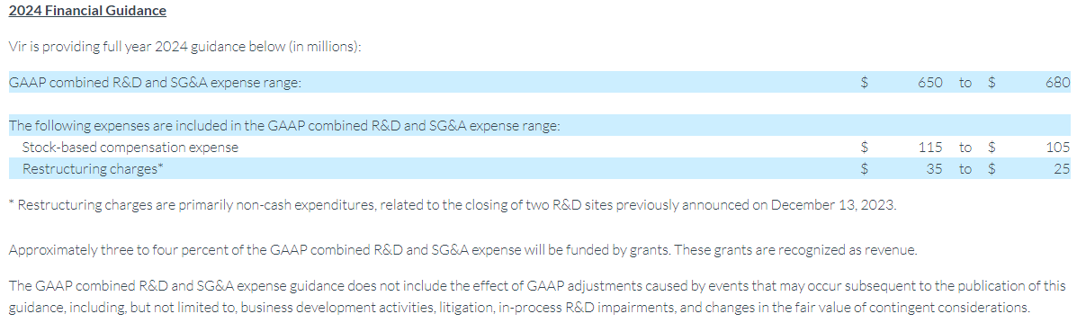 It should be noted the effect of some of those cash expenses on VIR's cash balance, about 3-4% according to the footnote, would be offset by grant funding recognized as revenue. To provide a comparison, R&D expense ($589.7M) and SG&A expense ($178M) totaled $767.7M in 2023, so bringing that down to $650M-$680M does mean that VIR is serious about reducing its expenses.