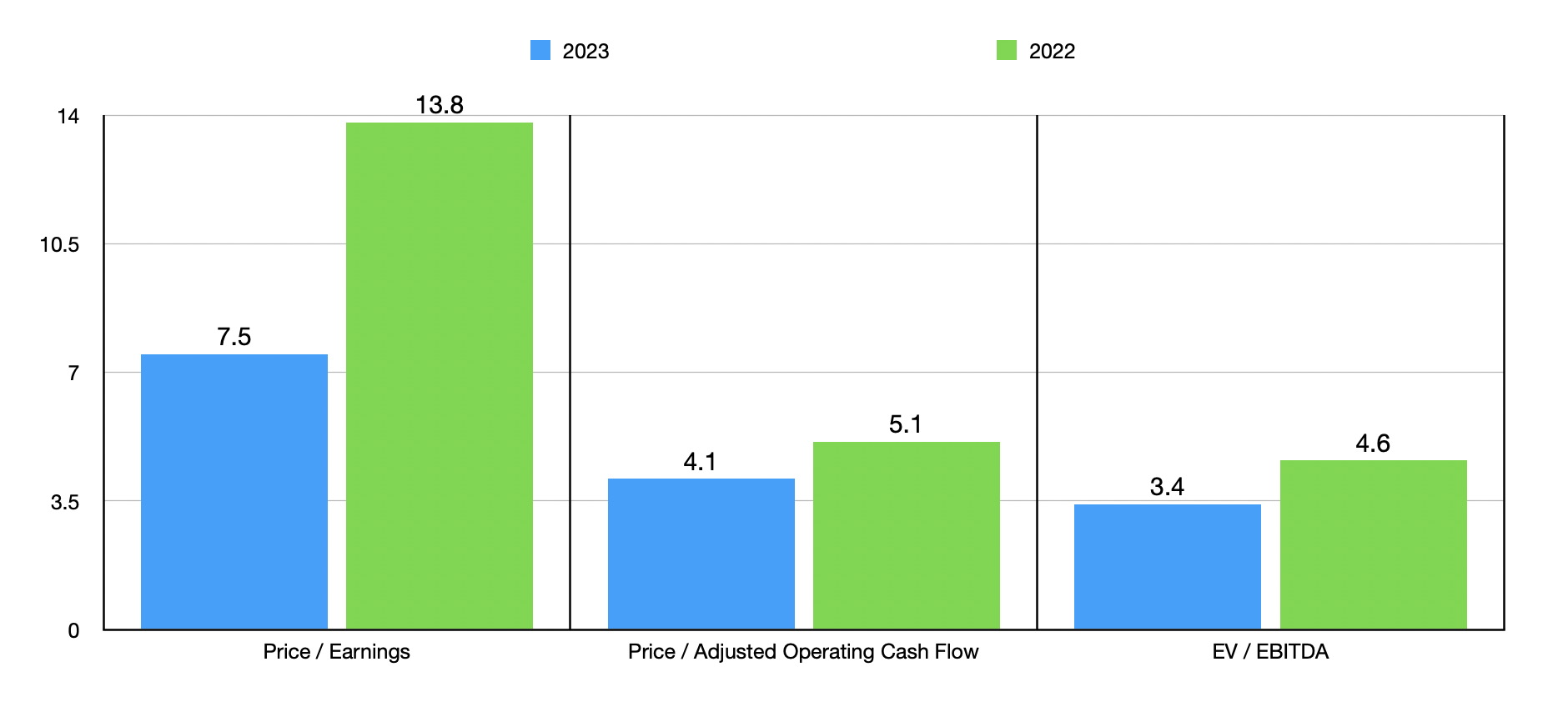 When it comes to valuing the company, the process is fairly straightforward. In the chart above, you can see how shares are priced using a price to earnings approach, a price to operating cash flow approach, and an EV to EBITDA approach. Using the 2023 results, the stock looks even cheaper than if we were to use the data from 2022. However, I would argue that shares look attractively priced in either case. In the table below, I then compared the company to five similar firms. What I found was that it ended up being the cheapest across the board.