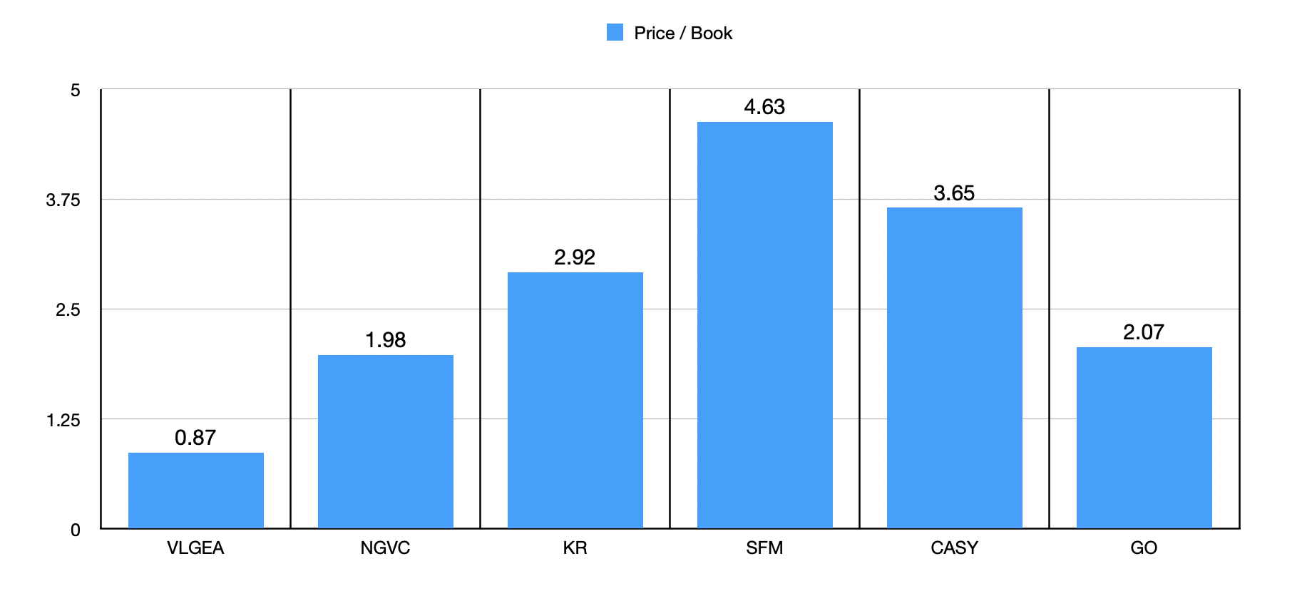 There are, of course, other ways to look at the enterprise. Another example would be through the price to book ratio. In the chart below, you can see how the price to book multiple for Village Super Market has consistently decreased over at least the past five years. The company is now trading at a real discount to its net assets. Sometimes this happens when a firm has a lot of leverage. However, cash exceeds debt to the tune of $33.5 million. So if anything, you'd expect the business to be trading at a premium to its book value. In the second chart below, you can also see how the price to book multiple stacks up against the same five firms I initially compared Village Super Market to. On a price to book basis, it was, once again, cheaper. In fact, I would take it a step further and say that it was substantially cheaper.