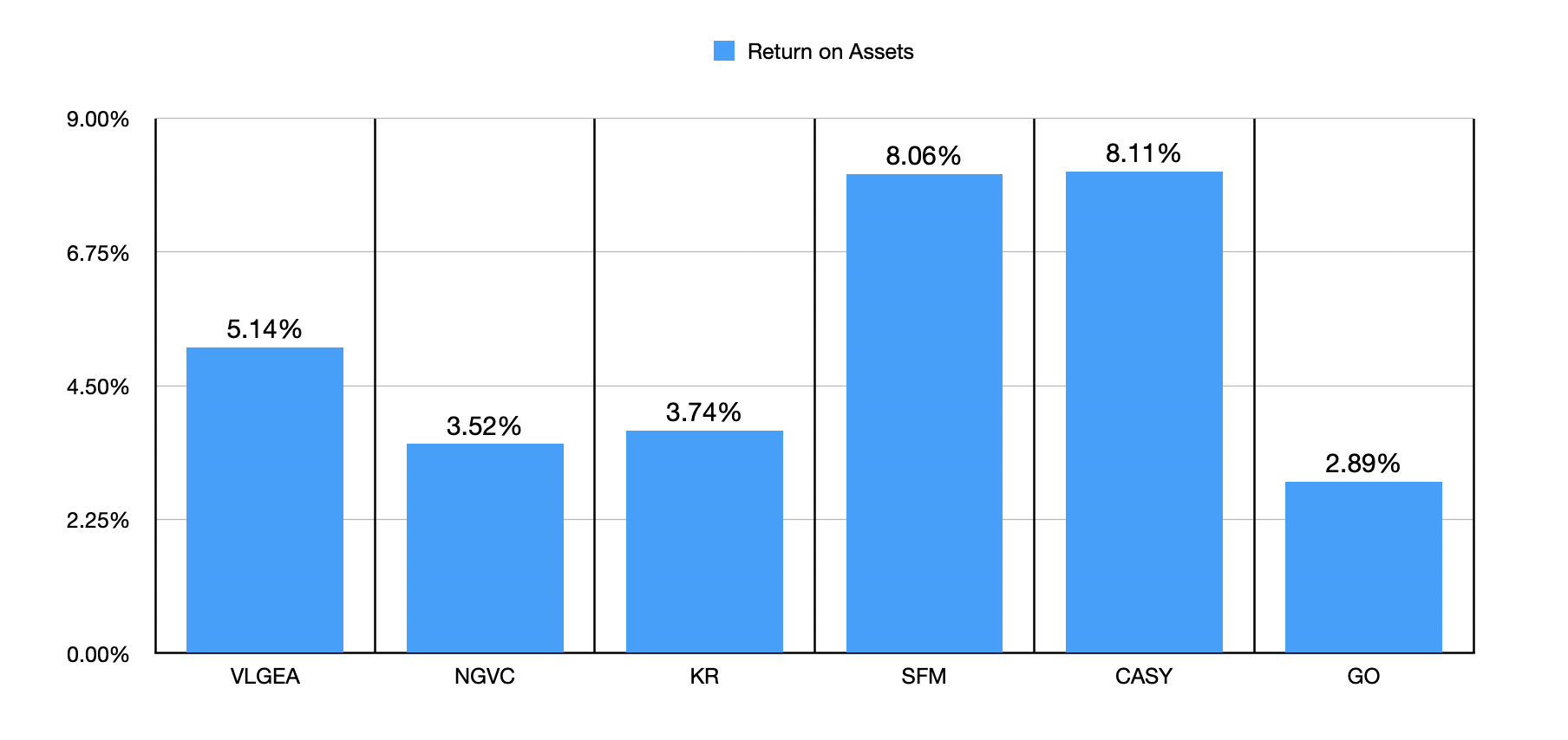 It would be one thing if Village Super Market had a history of a decline in its book value. But that is not the case. In each year between 2019 and 2023, the company has seen its book value per share increase, climbing from $22.15 to $27.61. By the first quarter of 2024, book value per share had risen further to $29.22. In the table below, I then decided to look at the picture through the lens of the return on equity for our prospect, as well as for the other five firms I compared it to. In this case, Village Super Market does fall short. Four of the five companies that I compared it to have a return on equity that is higher than what it has. But at 12.1%, it's not like Village Super Market is struggling. In the subsequent table below, I did the same thing with the return on assets. In this case, with a reading of 5.1% for 2023, Village Super Market ended up being higher than three of the five businesses.