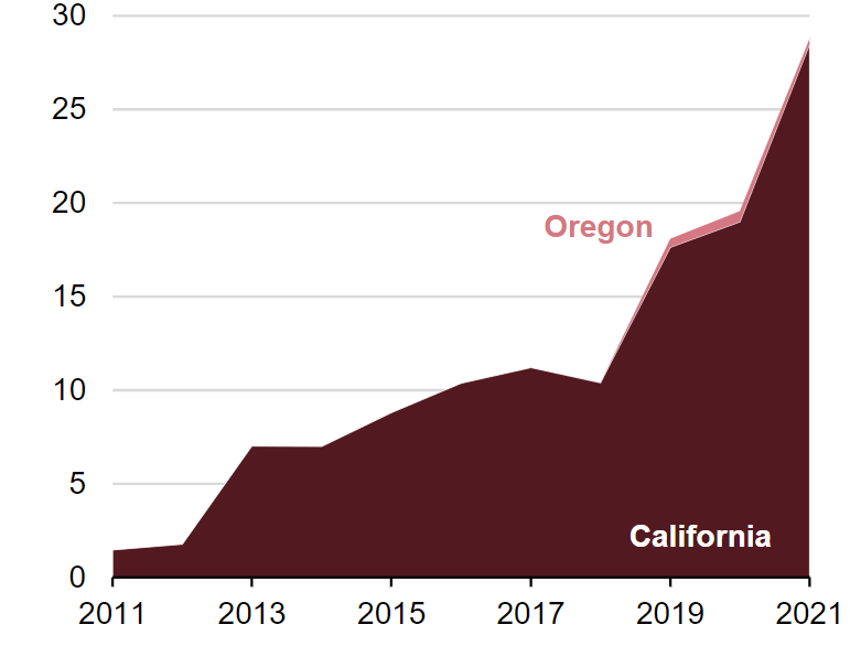 And it’s not just bio-diesel that RD is stealing market share from. In California, RD now makes up 49% of all diesel consumption with petroleum diesel making up the other 51%. Close to 600 (7.4%) of California’s gas stations offer RD. With government subsidies, the cost of RD and petroleum diesel has been virtually identical over the last several years.