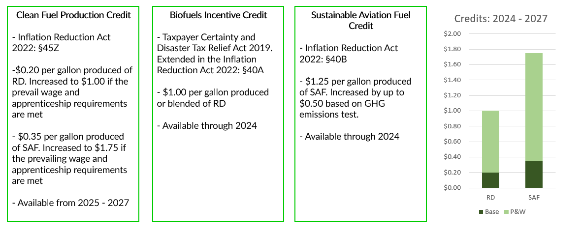 Both governments are putting their money where their mouth is. In the US, credits initiated by the Energy Policy Act of 2005 then expanded by the Energy Security and Independence Act of 2007 and the Inflation Reduction Act of 2022 have all but guaranteed healthy margins on the production of these two fuels for producers going forward. RD receives up to a $1.00 credit per gallon and SAF receives up to a $1.75 credit per gallon produced. While these credits are currently set to expire in 2027, they’ve been renewed in the past and will likely be renewed again, especially given the hope of increased production beyond 2027. Government accountability groups have demonstrated that long term policy uncertainty increases the price and stunts the growth of production over time which makes calls for longer policy certainty likely to be answered. Below is a diagram of relevant renewable fuel credits in play in the US.