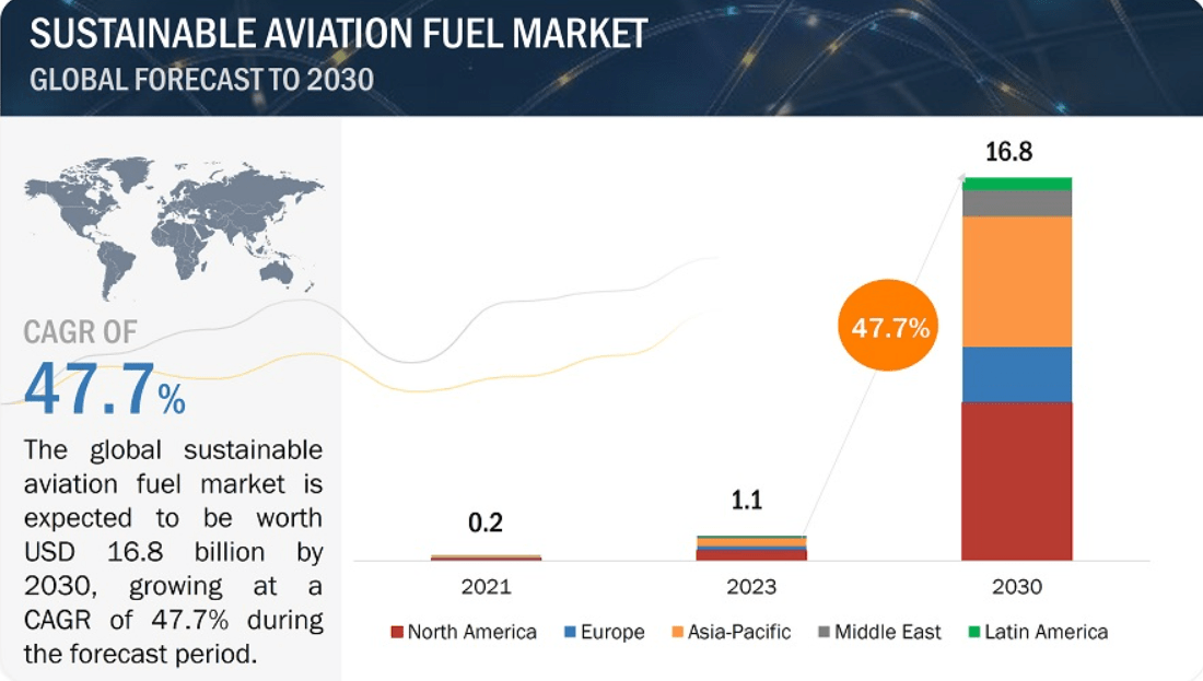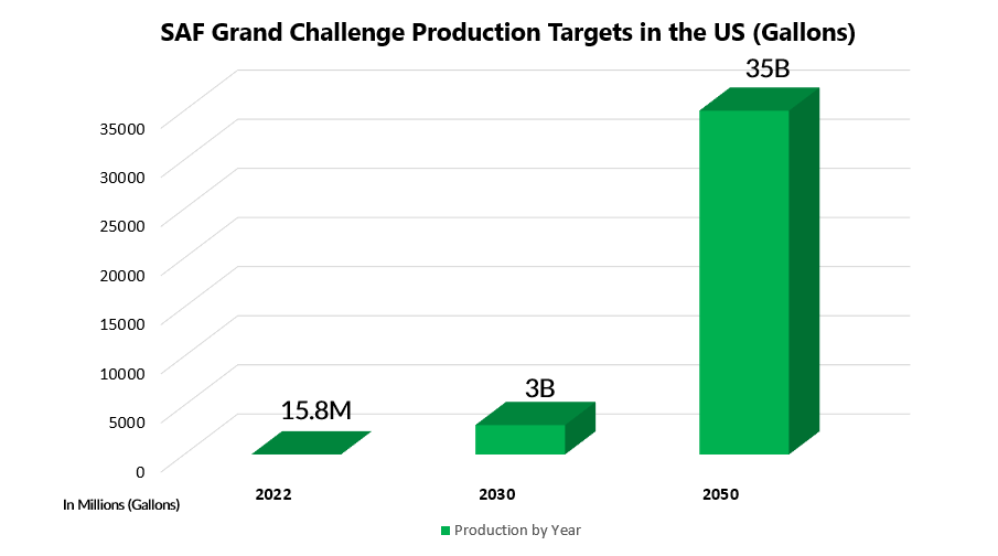 In the US, transportation accounts for approximately 29% of greenhouse gas emissions (GHG). Of that 29%, commercial planes and business jets make up 10% of it. To lower the GHG emissions produced by aviation, the Biden Administration introduced the SAF Grand Challenge in 2021. The Grand Challenge plans to increase SAF production from a mere 15.8M gallons in 2022 to 3B by 2030 and 35B by 2050.