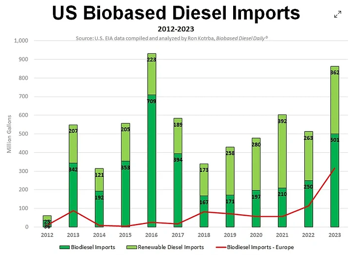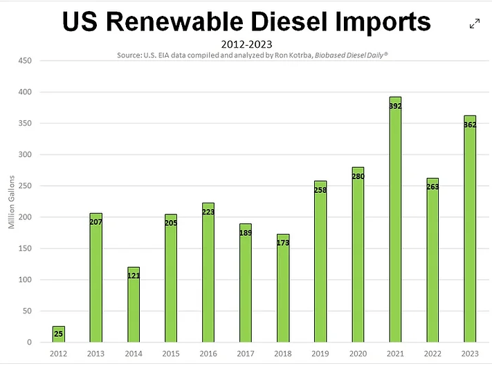 And the pace has not slowed since 2021. In fact, 2023 was a near record setting year for RD imports as domestic demand outstripped domestic supply by 362M gallons.