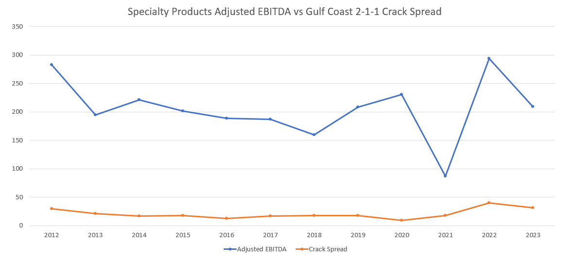 CLMT is a heavily levered entity. A recession could cause crack spreads to tighten and their cash flowing specialty products business to take a downturn which would make it hard for them to service their debt. We believe this scenario is unlikely however. Their specialty products business has shown incredible resilience even when crack spreads have collapsed. For example, their specialty products business was still able to generate 189M of adjusted EBITDA in 2016 when the Gulf Coast 2-1-1 Crack spread averaged a very low $12.33 that year (its currently $29.53 in March 2024).