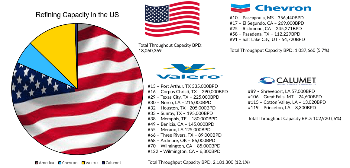 CLMT owns four of the 128 oil refineries still operating in the US. Their refineries are small. In sum, Calumet owns a mere 0.56% of the total refining capacity in the US, 1/10th the domestic capacity of Chevron and 1/20th the domestic capacity of Valero.