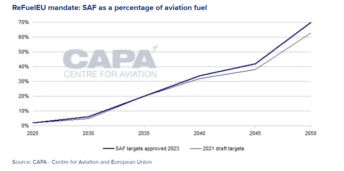 Europe has mandated a similar trajectory with their RefuelEU bill introduced in 2021 and confirmed in 2023 which seeks to replace petroleum based jet fuel with an increasing percentage of SAF ever year, reaching 70% replacement by 2050.