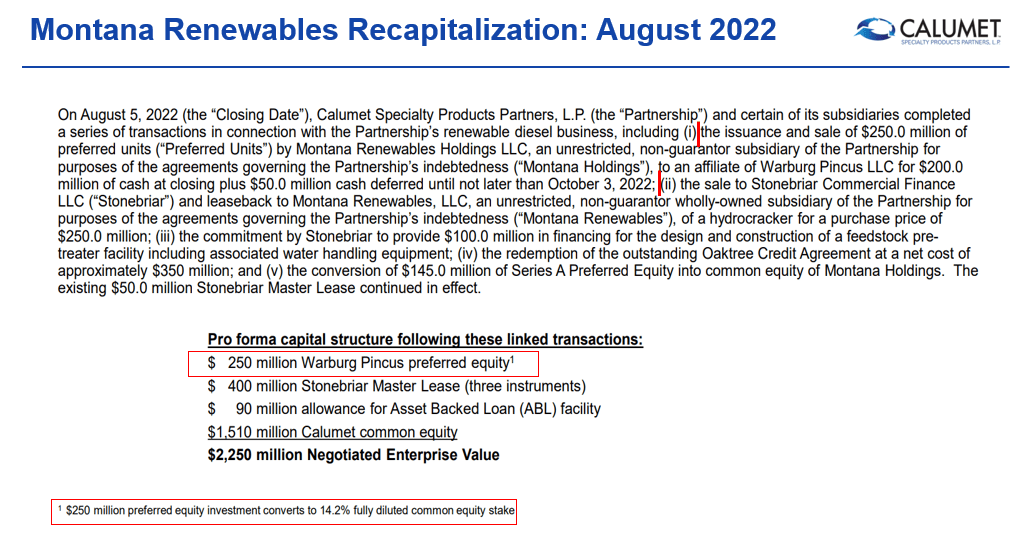 How do you value this new development within CLMT’s business? In 2022, the private equity firm Warburg Pincus paid 250M in cash in exchange for a preferred equity stake in MRL that converts to a 14.2% diluted common equity stake in CLMT. That deal valued the remaining 85.8% of CLMT’s common equity at approximately 1.51B.