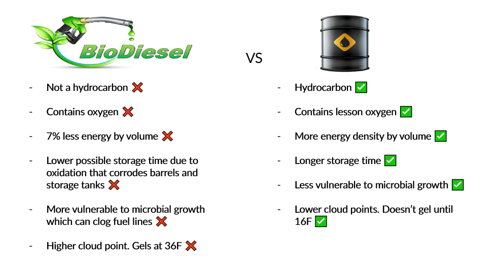 Unfortunately, biodiesel is a far inferior product compared to petroleum diesel. How so? Biodiesel isn’t a real hydrocarbon due to its oxygen content. The presence of oxygen makes it pack 7% less energy by volume. In addition, the oxygen can corrode barrels and storage tanks making the storage time of biodiesel significantly less. Oxygen renders biodiesel more vulnerable to microbial growth which can clog fuel lines. Finally, biodiesel has a higher cloud point which means it gels at a higher temperature, 36°F compared to the 16°F cloud point of petroleum diesel. Once biodiesel gels, it becomes difficult to transport via fuel lines. Due to the inferior qualities of biodiesel, it cannot be used as a standalone fuel. Instead, it must be blended in with traditional petroleum diesel which results in a less effective and pricier final product.
