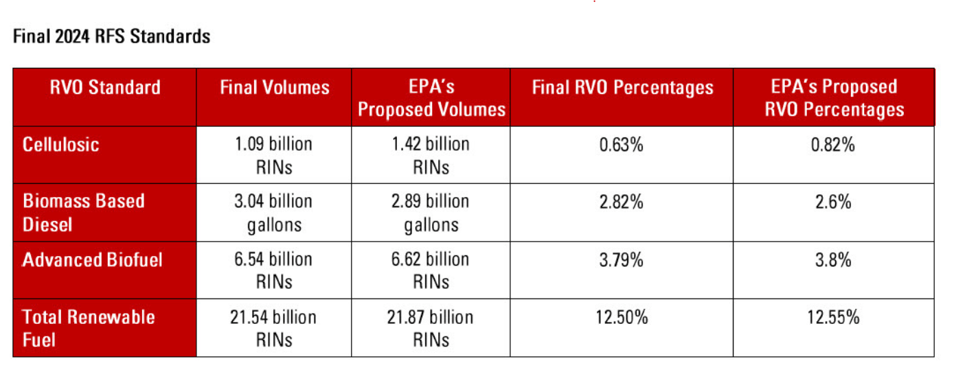 The government essentially taxes oil refiners and importers. For every gallon of oil that oil refiners produce or importers import, they must produce or pay the production cost of a certain percentage of renewable fuels. This percentage system is updated (typically increased) annually by the EPA. Here is what 2024’s system looks like: