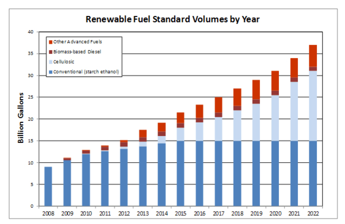 The EPA in partnership with the Department of Energy and the Department of Agriculture wanted to see the production of renewable fuels ascend from 9B gallons to 36B gallons domestically in under 15 years. They believed that goal could be accomplished by a composite of four renewable fuels.