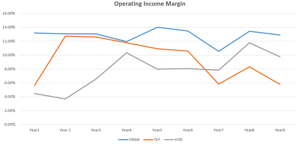 All this competition puts pressure on operating margins as shown in the chart below, which for Orange (in blue) has largely remained flat during the last nine years.