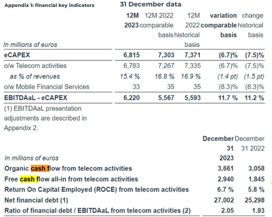 To further justify that the company is progressing on the free cash flow front, progress has also been made in terms of capex as a percentage of revenues, decreasing from 16.8% to 15.4%. Now combined with higher organic cash flow from telecom activities of €3,661 million (+19.7% YoY) FCF reached 2.9 billion euros at the end of last year, or an increase of 1.1 billion euros as tabled below. Moreover, these results have also been helped by €300 million of cost savings as part of the operational efficiency program elaborated when the new CEO took office, which includes a total of €600 million to be achieved by 2025.