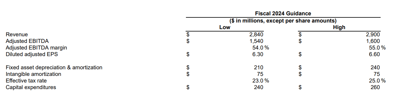 As shown in the table below, Verisk Analytics is guiding for approximately 8% revenue growth and 10% adjusted EBITDA growth for FY24.